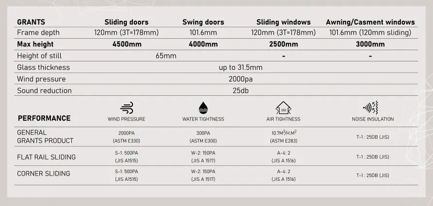 ชุด Grants มีตัวเลือกมากมายสำหรับการเปิดที่สามารถรองรับการเปิดขนาดใหญ่ทั้งความกว้างและความสูง ในขณะที่ความแข็งแรงและประสิทธิภาพยังคงอยู่ในระดับมาตรฐานระดับโลก